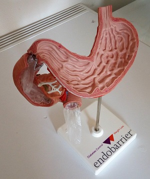 Теперь с 2011 года она активно применяется в европейских странах. Что представляет собой эндобарьер? Это полимерный шланг с тонкими стенками. Диаметр его составляет 3 сантиметра, а длина – 0,6 м. Помещают его в место перехода желудка в двенадцатиперстную кишку. За ее пределы он продолжается на несколько десятков сантиметров. После установки эндобарьера пища из желудка следует в так называемый тоннель. Со стенками тонкой кишки она не контактирует. Пока пища не проходит весь эндобарьер, она не начинает всасываться. В результате, приблизительно за год, пациенты теряют примерно пятую часть начального веса тела. Это оказывает положительное действие на течение сочетанной патологии – ожирения и сахарного диабета.
