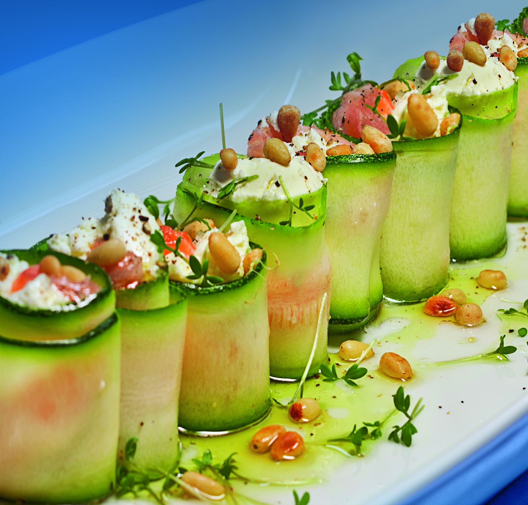 · На полоску цуккини уложить ломтик семги, чайную ложку сырной смеси, завернуть рулетиком. При необходимости заколоть шпажкой. Сделать то же самое с оставшимися полосками цуккини.