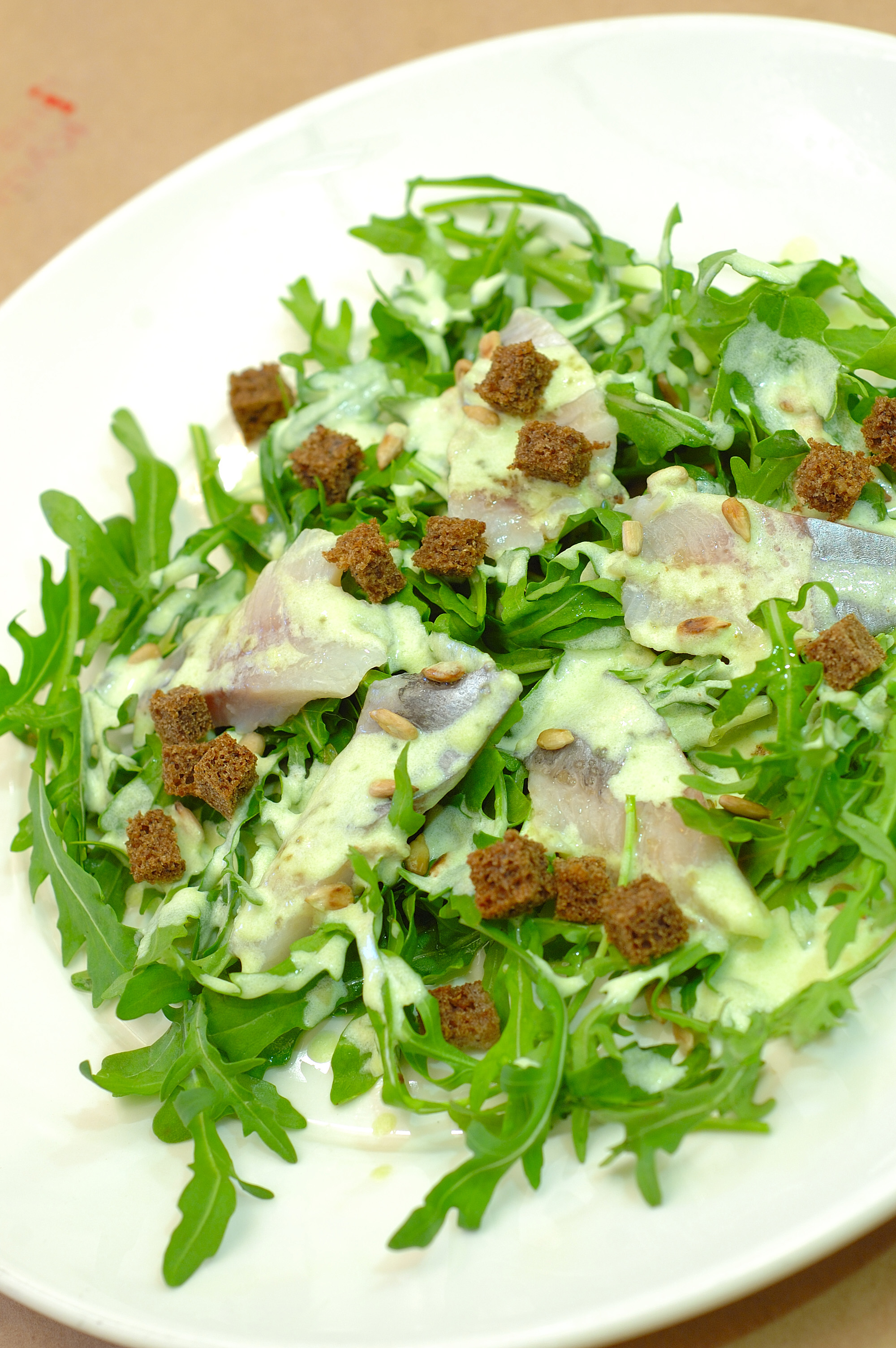 · Подавать сельдь на тарелках с салатом руккола, спрыснутым подсолнечным маслом, полив филе сметанным соусом и посыпав все свежеобжаренными подсолнечными семечками, сухариками из бородинского хлеба и колечками красного лука.
