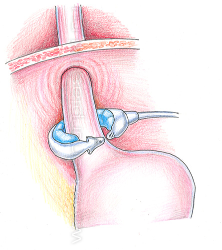 На верхнюю часть желудка накладывается регулируемый бандаж в форме кольца. После операции желудок принимает форму песочных часов. Таким образом, желудок разделяется на малый желудочек и большую его часть. Объем маленького желудочка – всего 10-15 миллилитров. Таким образом, человеку достаточно столовой ложки еды, чтобы насытиться. Именно такое количество пищи заполняет «малый желудочек» над кольцом и воздействует на рецепторы насыщения. Это вызывает ощущение сытости у человека, который съел, возможно, всего четвертинку яблока ( а у него возникает ощущение, что он 3 часа сидел за столом).